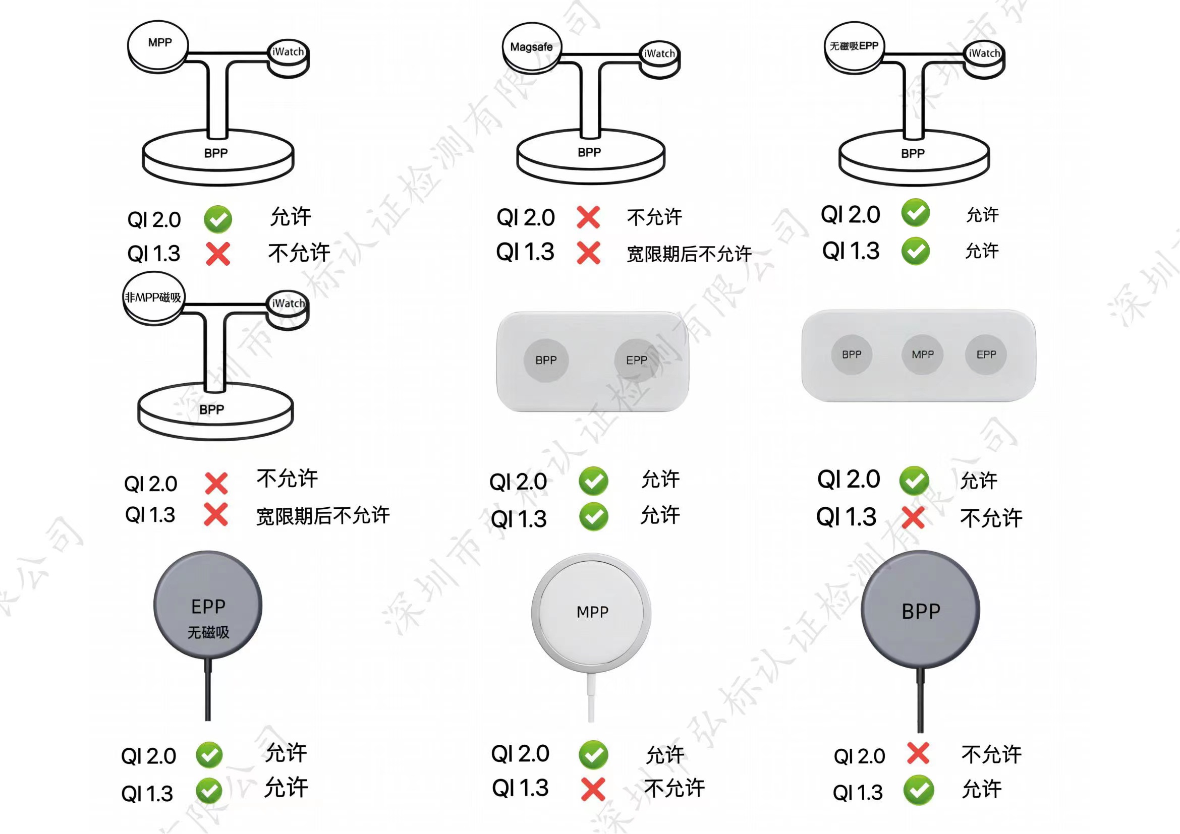 1.包含MPP磁吸手机充电位的多合一产品是允许的。2.包含非MPP磁吸手机充电位的多合一产品是不允许的。4.多合一产品应包含至少一个MPP或EPP发射器。5.多合一产品中的所有兼容Qi的发射器都必须通过Qi v2.0认证。6.所有的MPP或EPP充电区域应包括身份认证功能。7.BPP变送器可以包含在多合一产品中,但不能作为子系统认证。(因为Qi2.0 BPP子系统不可认证)。8.任何非Qi2的位置应在最初注册阶段进行声明,并由ATL实验室进行验证(例如定制智能手表充电器)。1.已通过早期规范版本认证的子系统不能集成到Qi2.0中,除非为Qi2.0重新认证这些子系统。2.与Qi1.3.3多合一产品规则相比,在产品充电位面上不再需要打印Qi2标识。基于Qi1.3.3认证,多合一产品应符合以下要求: 从Qi v2.0认证开始90天后,包含磁吸的多合一产品将不能再获得Qi1.3.3认证,在90天过渡期内,将继续执行2022年起的旧政策。1. 90天过渡期后,包含智能手机磁吸对位的充电区域将不再不允许。4. 任何非Qi2的位置应在最初注册阶段进行声明,并由ATL实验室进行验证(例如定制智能手表充电器)。5. 包含磁吸的多合一产品制造宽限期是注册宽限期结束后的一年。WPC将在未来继续认证基于v1.3.3的多合一PTx产品,直到v1.3.3失效。无磁吸多合一产品充电位上面不需要打印Qi Logo。